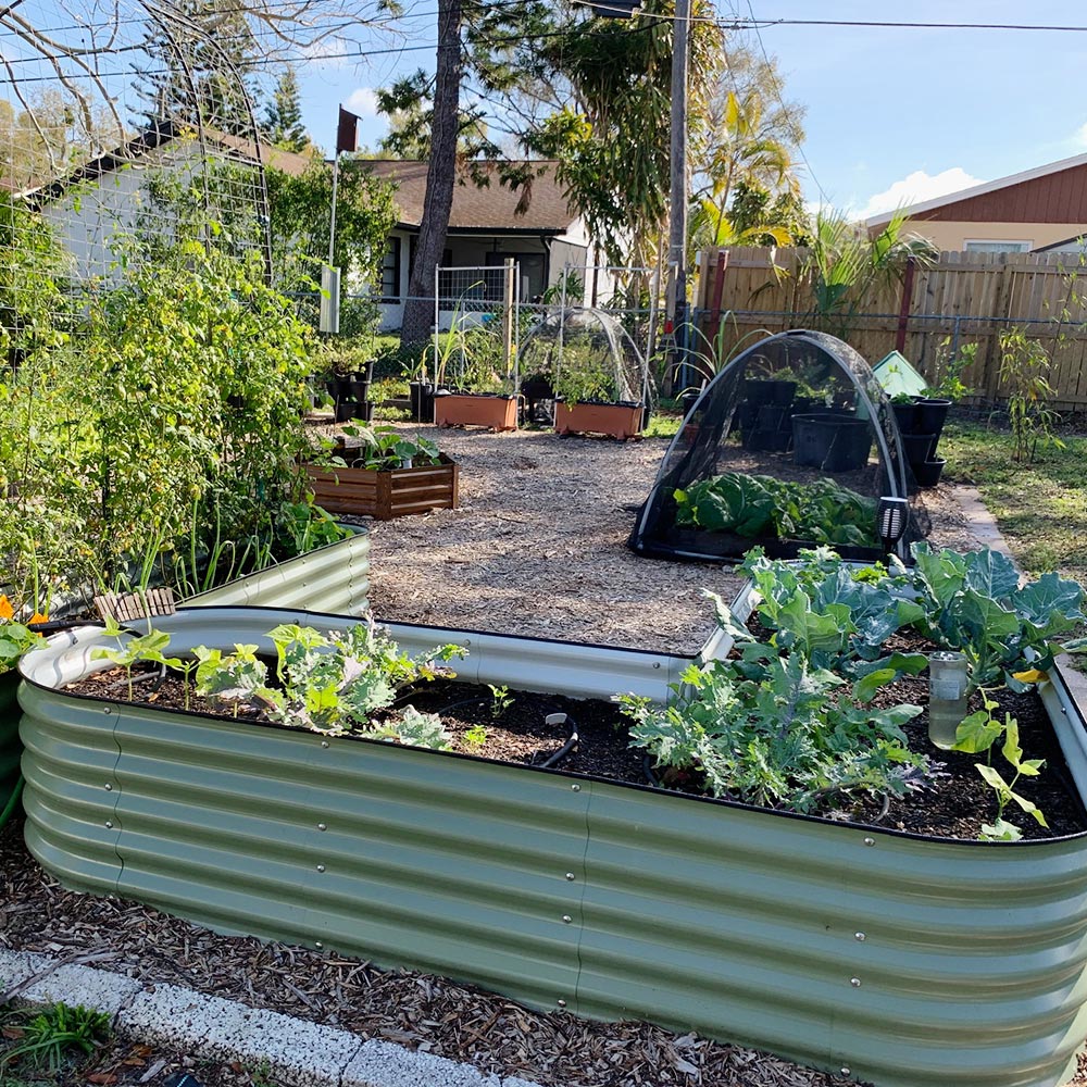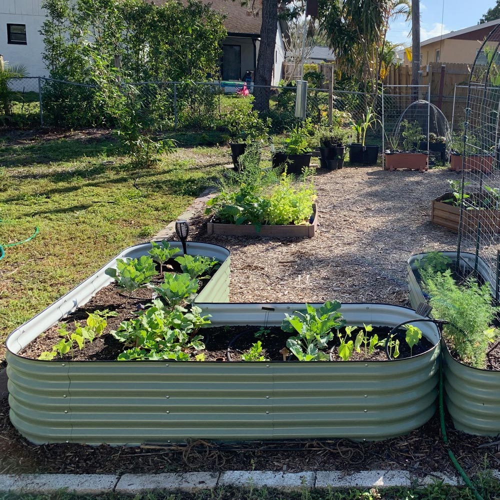 These L-shaped raised garden beds offer improved pest resistance and season extension. They also allow for better soil life, drainage, and root growth.